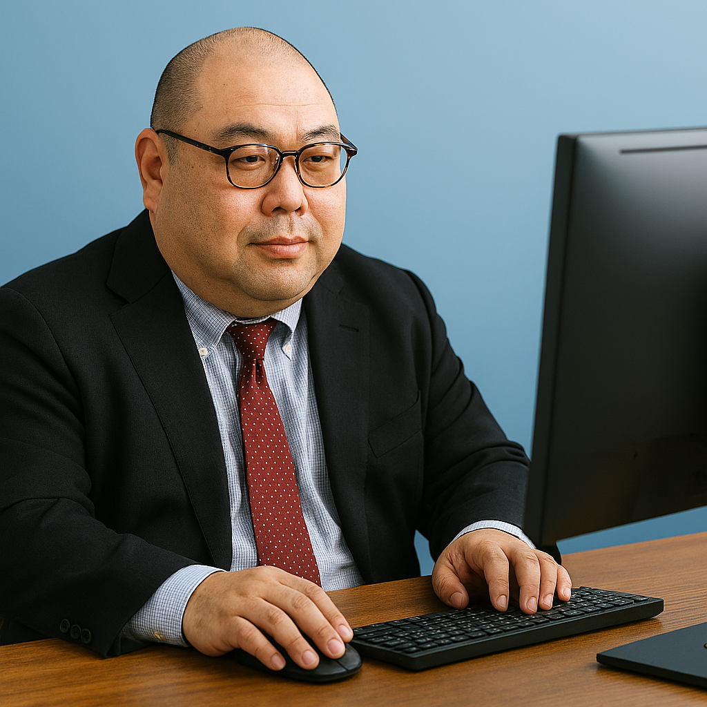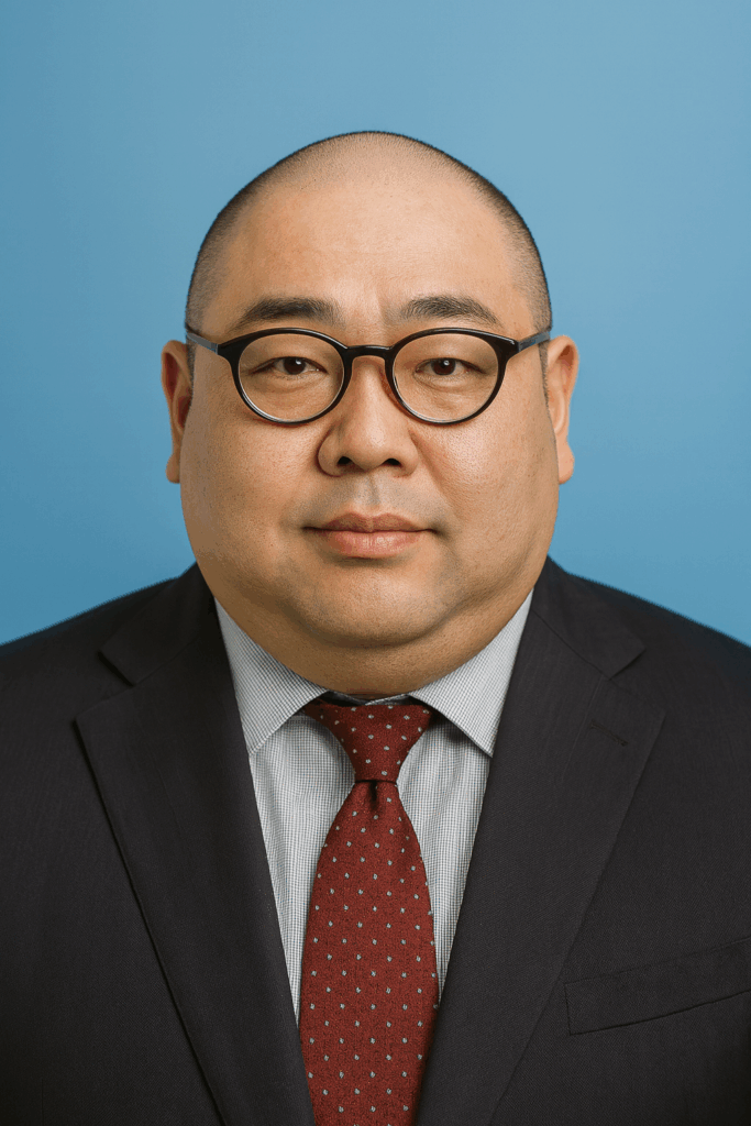A formal portrait of a middle-aged Japanese man with a round face, bald head, and heavy build. He wears a dark suit jacket, a light checkered dress shirt, and a red polka-dot tie. He has round dark-framed glasses and a calm, confident expression. The background is a soft light blue, evoking a professional studio setting. The lighting is even and flattering, highlighting his facial features and attire.