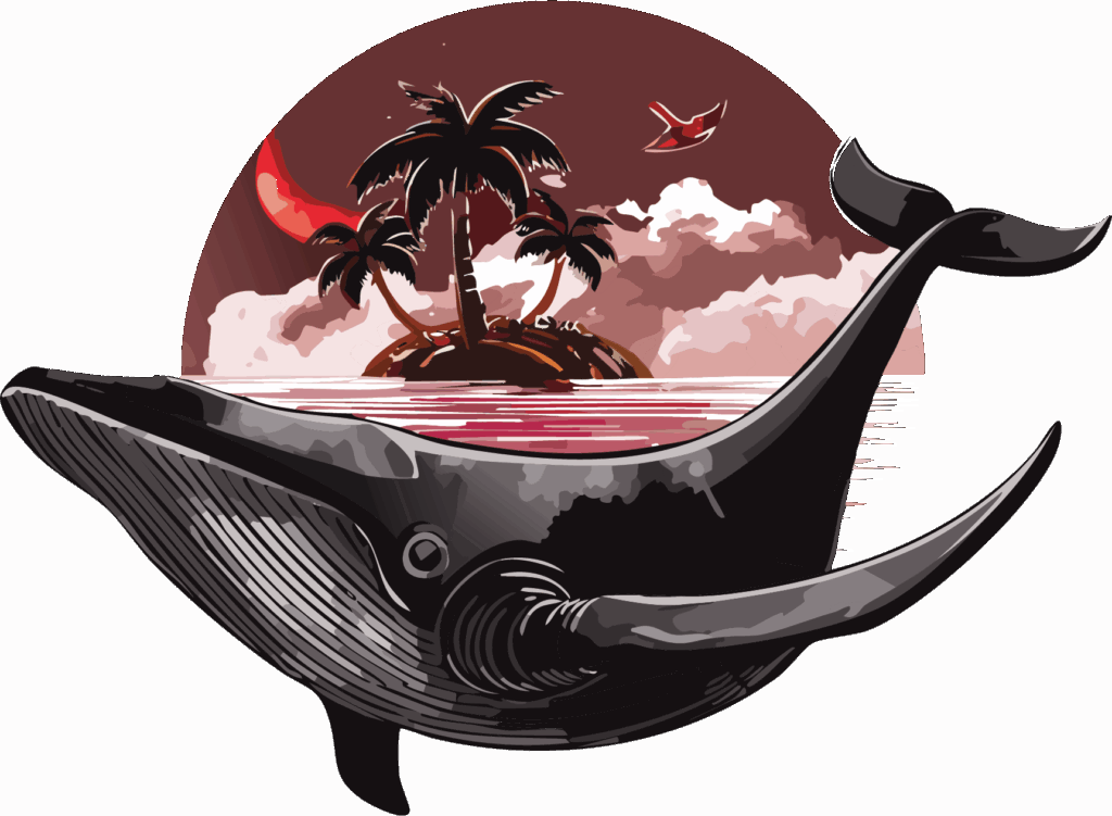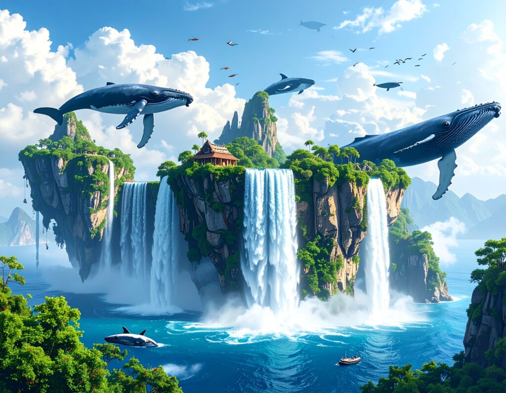 プロンプト「海の上に空に浮かぶ島が複数あって滝のように水が流れていてその中に空を飛ぶクジラや魚が居る_クジラは大きいのが1匹 島は上下に別れたりいろんなバリエーション 662710」