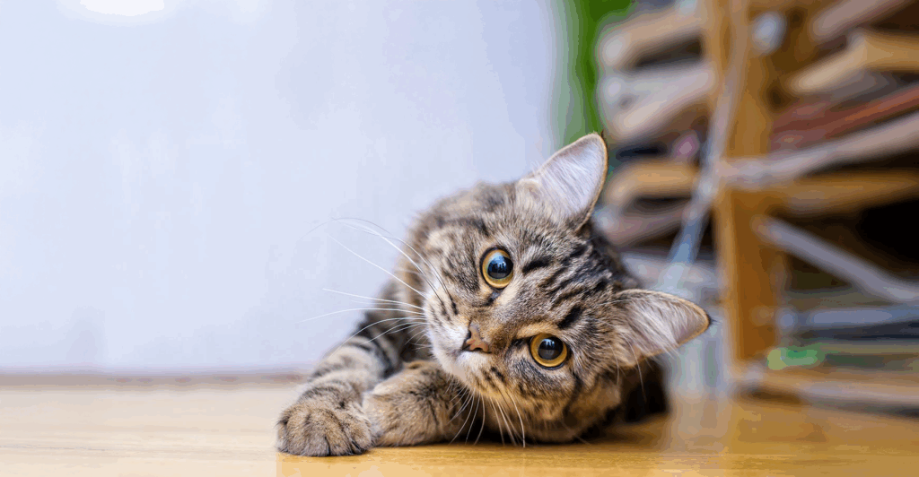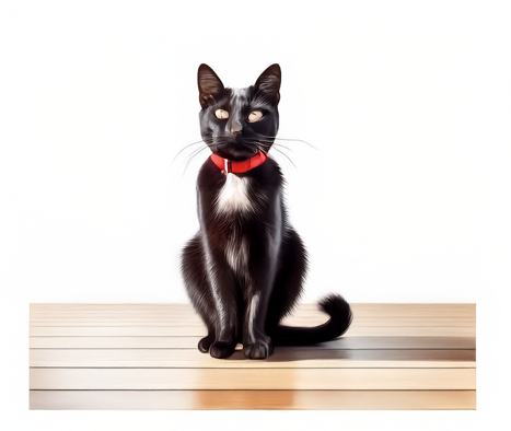 A photo-realistic image of a black cat sitting on a wooden floor, wearing a red collar, with soft natural lighting