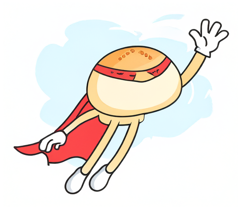 Japanese anpan, sweet bun, bread character,arms up, legs, expressive eyes,cape, superhero costume,flying, soaring, rescuing, helping,whimsical, cartoonish, heroic,Superman-like, Japanese snack hero,sky, clouds, dramatic lighting,saving people, helping those in need,dainamic pose